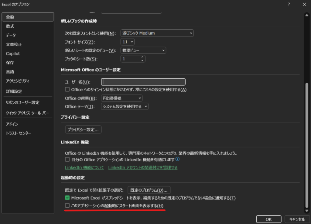 4. 「起動時の動作」セクションにある「このアプリケーションの起動時にスタート画面を表示する」のチェックを外します。